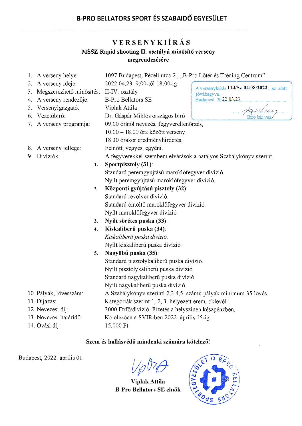2022. április 23-án B-Pro rapid shooting minősítő versenyt tartunk.